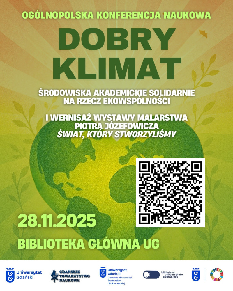 Wydział Nauk Społecznych Uniwersytetu Gdańskiego (Instytut Pedagogiki, Zakład Pedagogiki Społecznej) jest współorganizatorem Ogólnopolskiej Konferencji Naukowej „DOBRY KLIMAT. Środowiska akademickie solidarnie na rzecz ekowspólności”, która odbędzie się 28 listopada 2025 roku (piątek) w Bibliotece Uniwersytetu Gdańskiego.