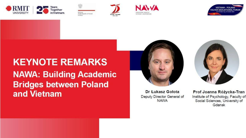 W tym roku Polska i Wietnam świętują 75-lecie nawiązania stosunków dyplomatycznych, a Uniwersytet Gdański 55-lecie powstania. W ramach wydarzenia z cyklu Edu&Science Meetings w dniach 30.10-04.11.2026, zorganizowanego przez NAWA we współpracy z Ambasadą RP w Hanoi w dwóch największych miastach Wietnamu - Hanoi i Ho Chi Minh City, odbyto szereg spotkań partnerskich w formule okrągłego stołu z lokalnymi uniwersytetami, podczas których dr hab. Joanna Różycka-Tran, prof. UG z Instytutu Psychologii UG zaprezentowała projekt „Stosowana psychologia społeczna w kontekście międzykulturowym: synergie UG z Wietnamem” ASPIC Partnerstwa Strategiczne NAWA. Projekt cieszył się ogromnym zainteresowaniem zarówno podczas Vietnam-Poland Higher Educational Forum na Uniwersytecie RMIT w Saigonie w dniu 31.10 jak również podczas Roundtable uniwersytetów wietnamskich i polskich na Uniwersytecie HUMG w Hanoi w dniu 4.11, ponieważ jest to jedyny projekt realizowany w dziedzinie nauk humanistycznych/psychologii w Wietnamie na tak dużą skalę.