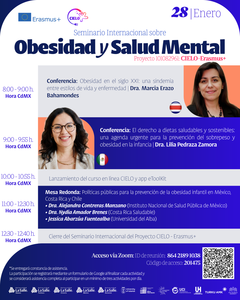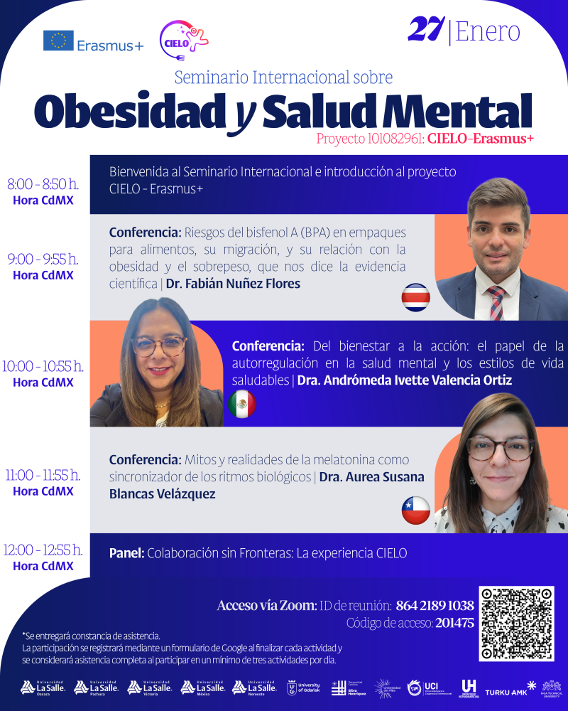 You are cordially invited to participate in a seminar on obesity and mental health, which will take place on 27–28 January 2026 via Zoom. The seminar is organised as part of the CIELO (Innovative Curriculum for Latin America to Build Capacity in HEIs to Prevent Obesity) project, in which UG is a partner.